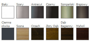 - Profile dostępne są w kolorach RAL: biały oraz ANODA: srebrny, szampański, antracyt, ciemna oliwka, czarny, brąz, DREWNOPODOBNY: orzech, złoty dąb, dąb bagienny, sosna, mahoń.